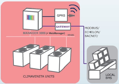 通過MANAGER 3000,可與BAS/BMS管理系統進行通訊可支持: MODBUS通訊協議的串口模塊,LONWORKS通訊協議的模塊,BACNET通訊協議的模塊