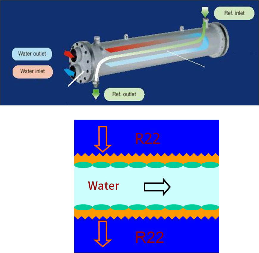 1.The copper tube of flooded type evaporator are completely dipped inside the boiling liquid refrigerant. Thanks to this design, the unit performance and COP are enhanced obviously;